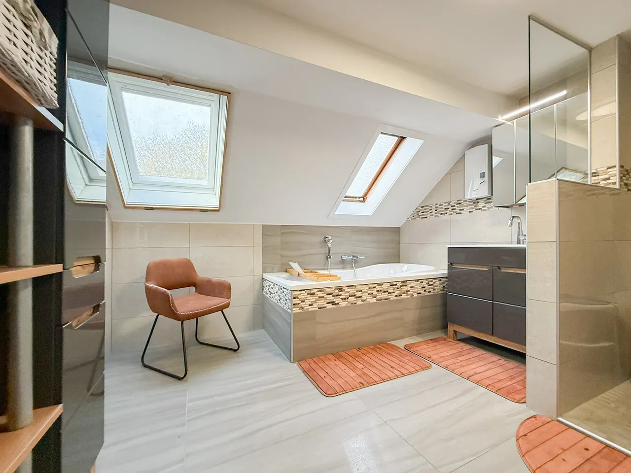 Das Dachgeschoss verfügt über zwei weitere Räume, ein schickes Vollbad und ein weiteres WC. Diese Ebene eignet sich ideal für den heranwachsenden Jugendlichen, der das „Hotel Mama“ noch nicht verlassen möchte.