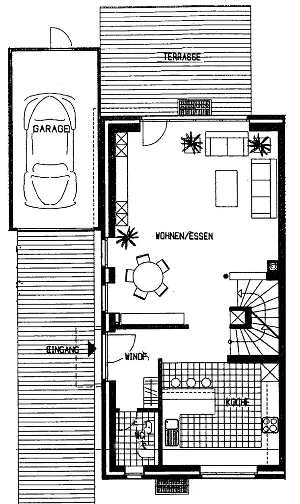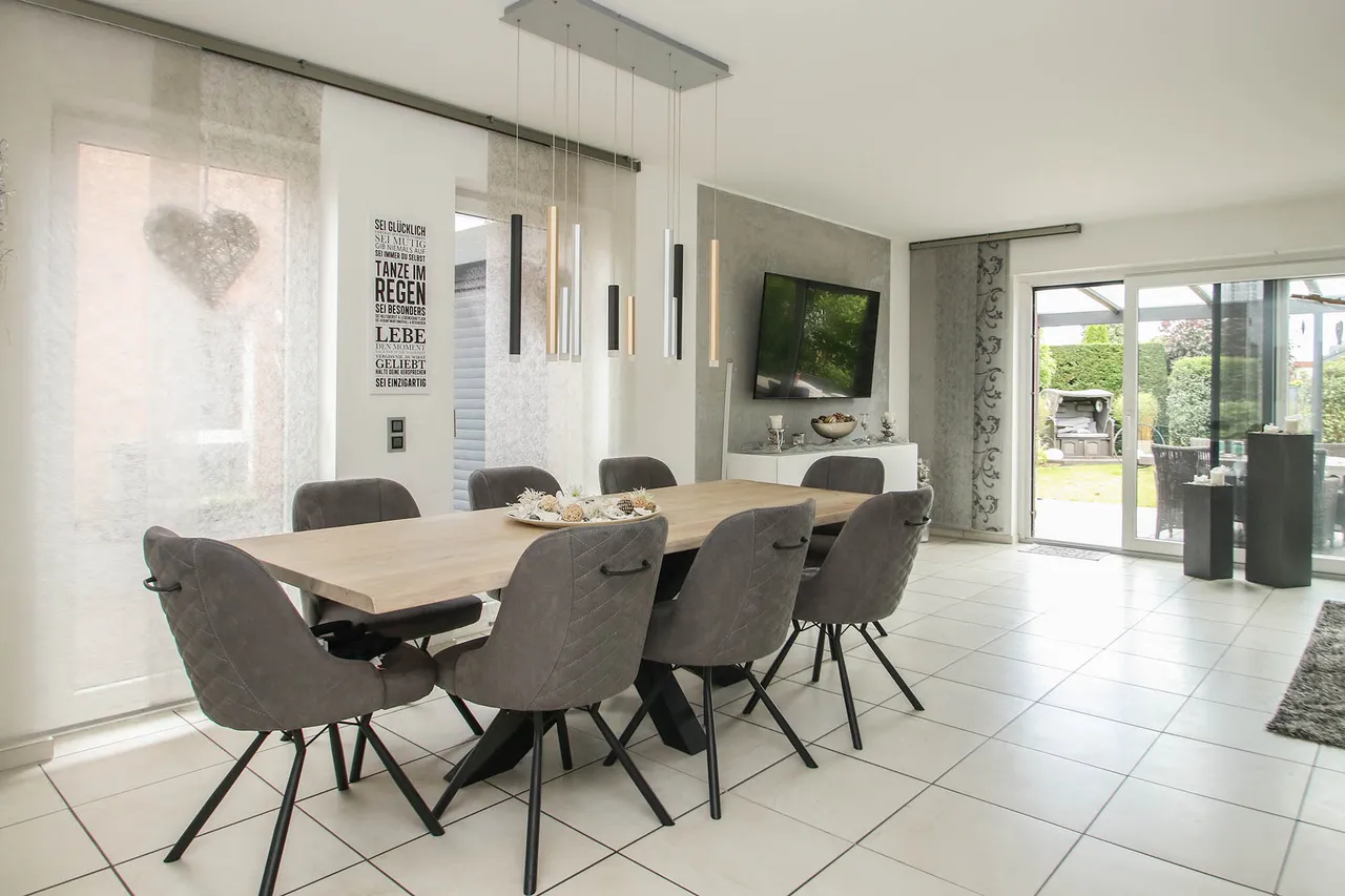 Über das einladende Entree gelangt man in den über 35 m² großen und lichtdurchfluteten Wohn- und Essbereich. Für viel Licht und einen ungestörten Blick ins Grüne sorgen die bodentiefen Fenster. Der liebevoll angelegte Garten mit überdachter Terrasse lädt zu Grillpartys mit der ganzen Familie ein – auch bei wechselhaftem Wetter.