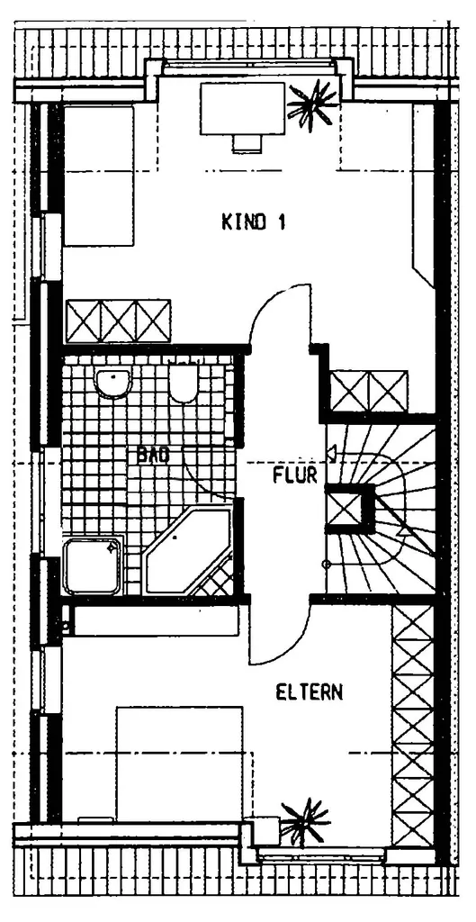 Im Dachgeschoss befinden sich zwei Schlafräume und das Wannen- und Duschbad.