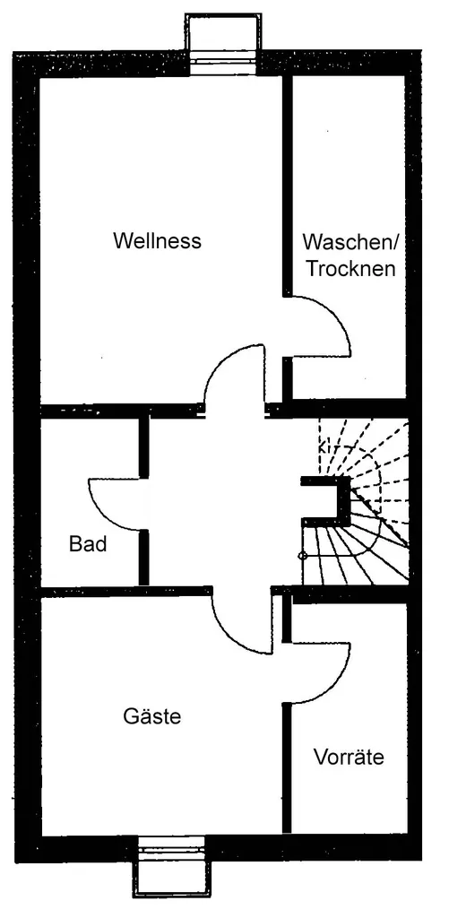 Das Haus ist voll unterkellert. Zwei Räume im Untergeschoss besitzen Wohnqualität – einer davon wird als Wellnessbereich mit Sauna genutzt. Hier befindet sich auch ein weiterer Duschbereich ohne Sanitärinstallationen. Vorrats-, Wasch- und Heizungsraum runden das Raumangebot ab.