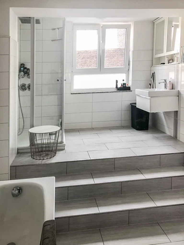 | Bad mit Dusche, Wanne, Fenster |