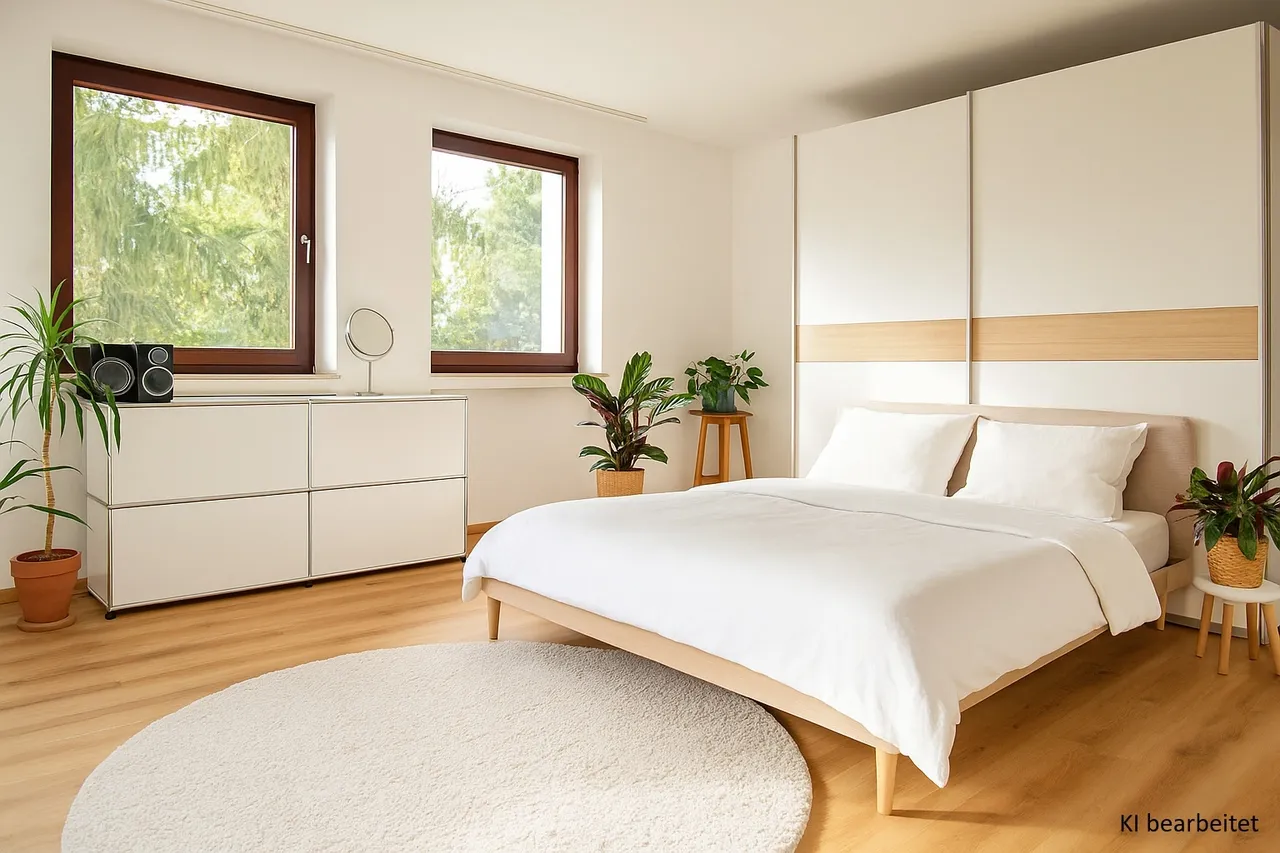 Elternschlafraum und Kinderzimmer liegen durch eine halbe Treppe auf unterschiedlichem Niveau – so hat jeder in der Familie seinen eigenen Bereich. Einer der Schlafräume verfügt zusätzlich über Zugang zum Balkon.