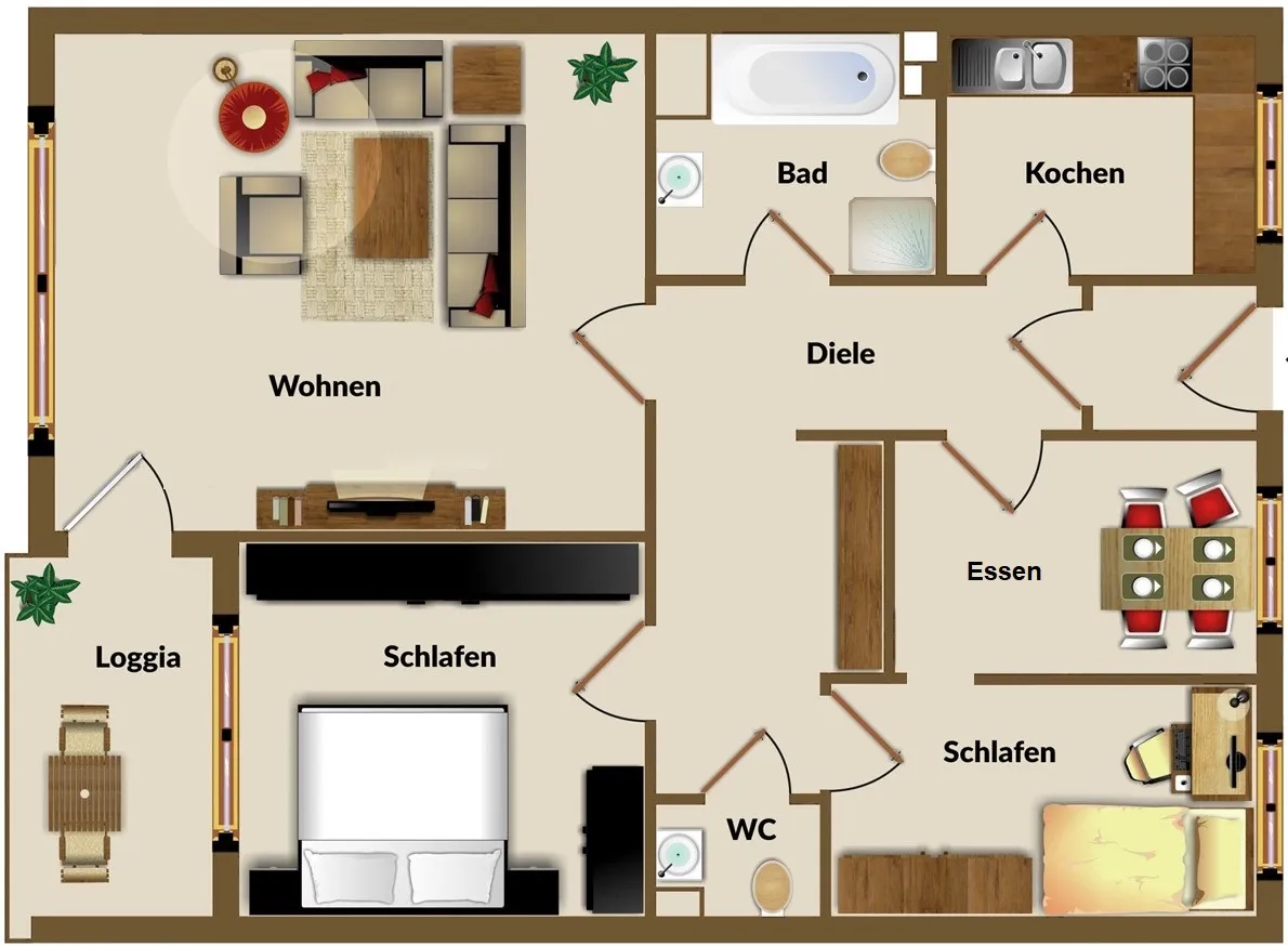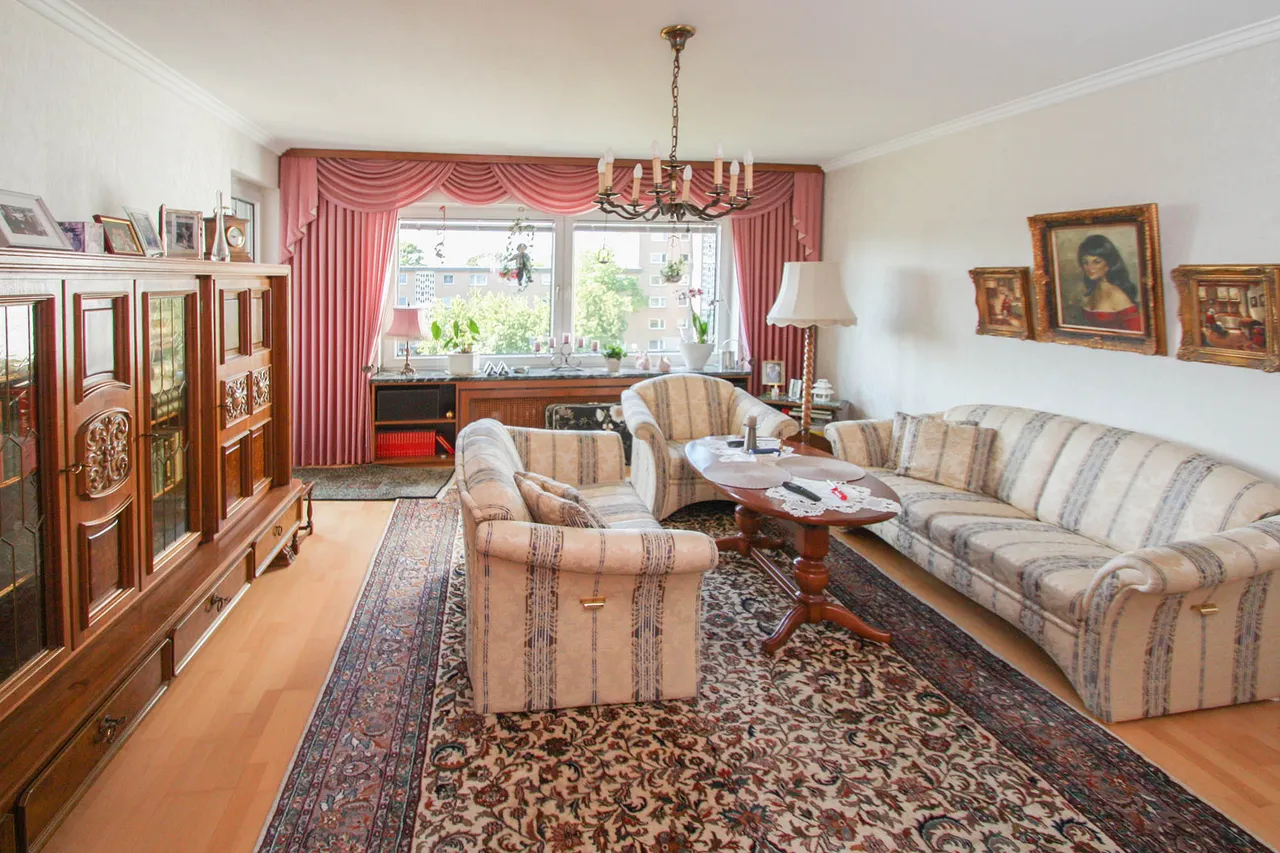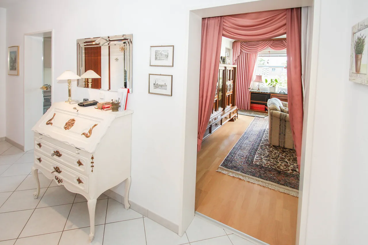 Der Grundriss ist durchdacht und zweckmäßig, drei oder vier Zimmer verteilen sich auf ca. 84 m² Wohnfläche. Mittelpunkt der Wohnung ist der helle Wohnbereich mit Austritt auf die sonnige Südloggia.