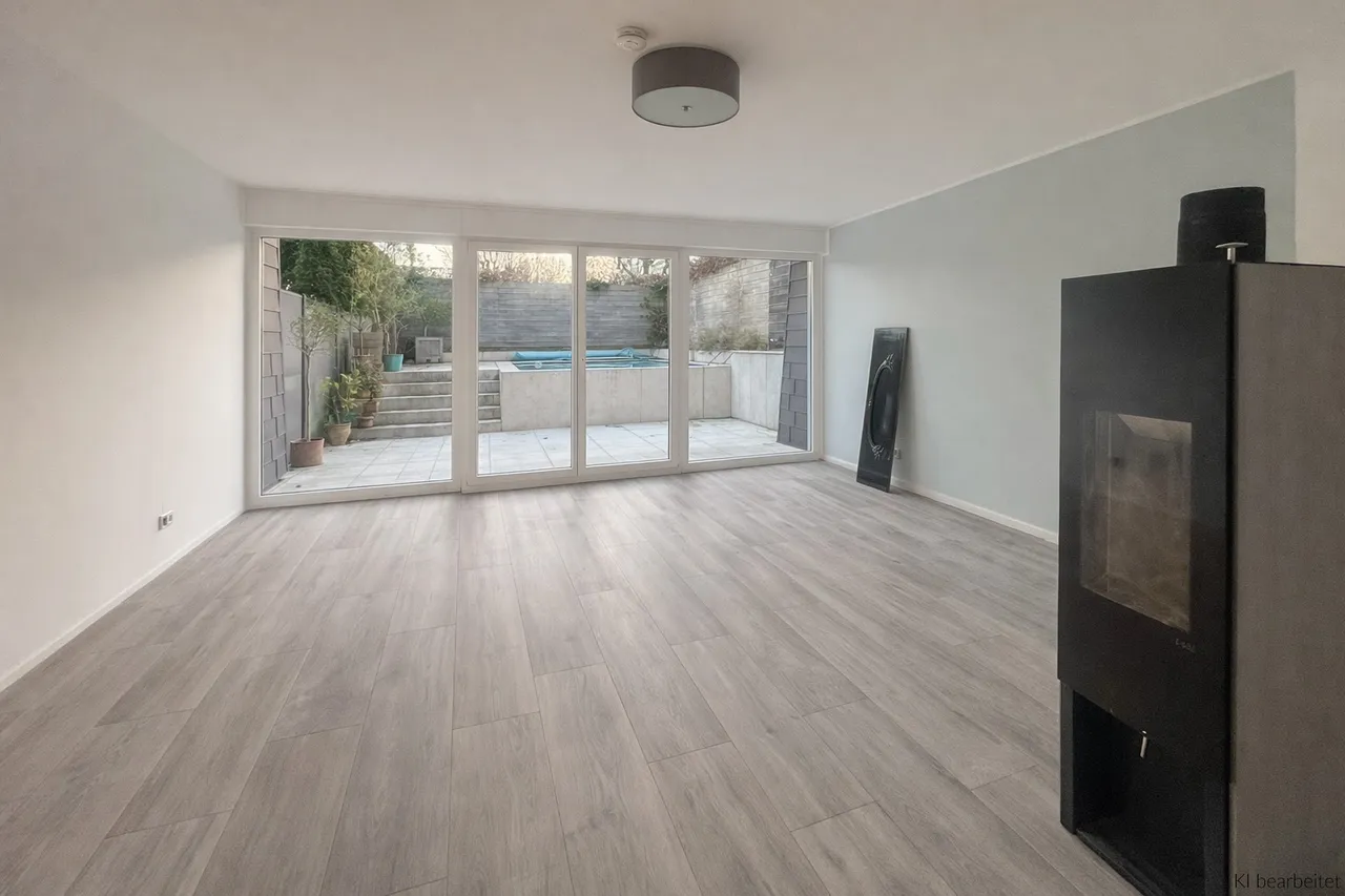 Im Gartengeschoss liegt der zweite Wohnraum mit Zugang zur Terrasse und dem geschützten Außenbereich mit beheizbarem Pool – ein Ort zum Entspannen, spielen und für gesellige Stunden im Freien. Der Designer-Kaminofen sorgt im Winter für Gemütlichkeit.