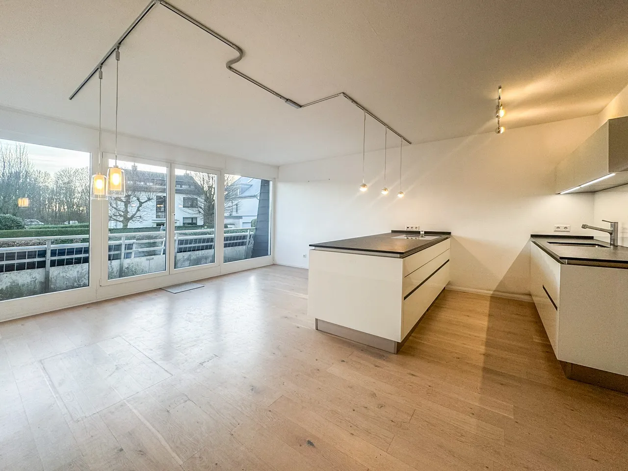 Die Eingangsebene empfängt Sie mit der hellen Wohnküche, zur sonnigen Südseite ausgerichtet. Die neuwertige NEXT-Einbauküche ist mit MIELE & SIEMENS Elektrogeräten ausgestattet. Gäste-WC und Abstellraum ergänzen die Etage.