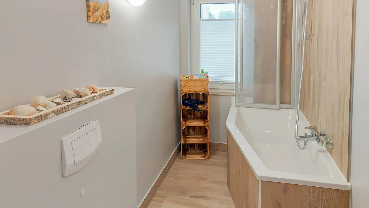| Bad mit Dusche, Wanne, Fenster |