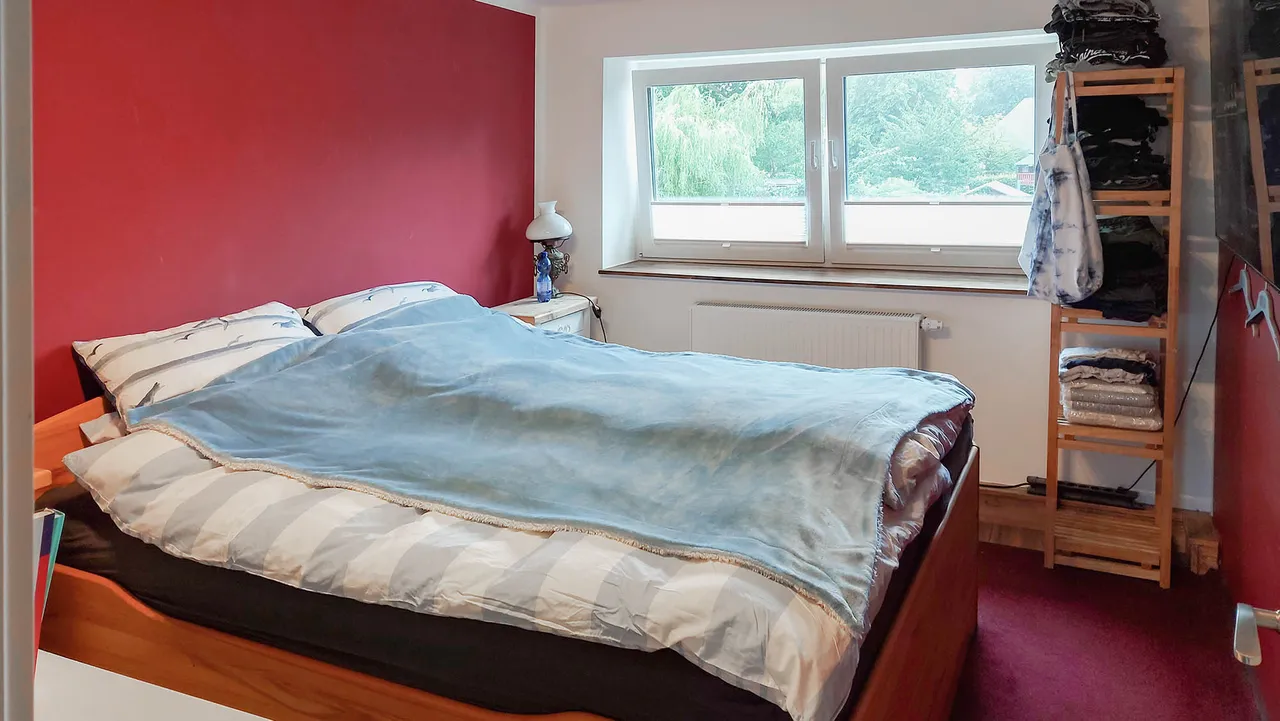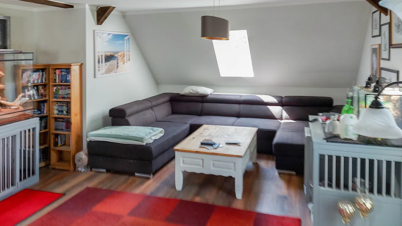 Das Dachgeschoss ist über einen separaten Hauseingang erreichbar und wurde 2019 modernisiert. Offene Holzbalken sorgen für ein gemütliches Wohnambiente. Hier stehen Wohnbereich, eine offene Wohnküche, drei Schlafräume, Ankleidezimmer sowie ein schickes Duschbad mit angrenzendem Hauswirtschaftsraum zur Verfügung. Die Wohnküche verfügt über einen Kaminanschluss.